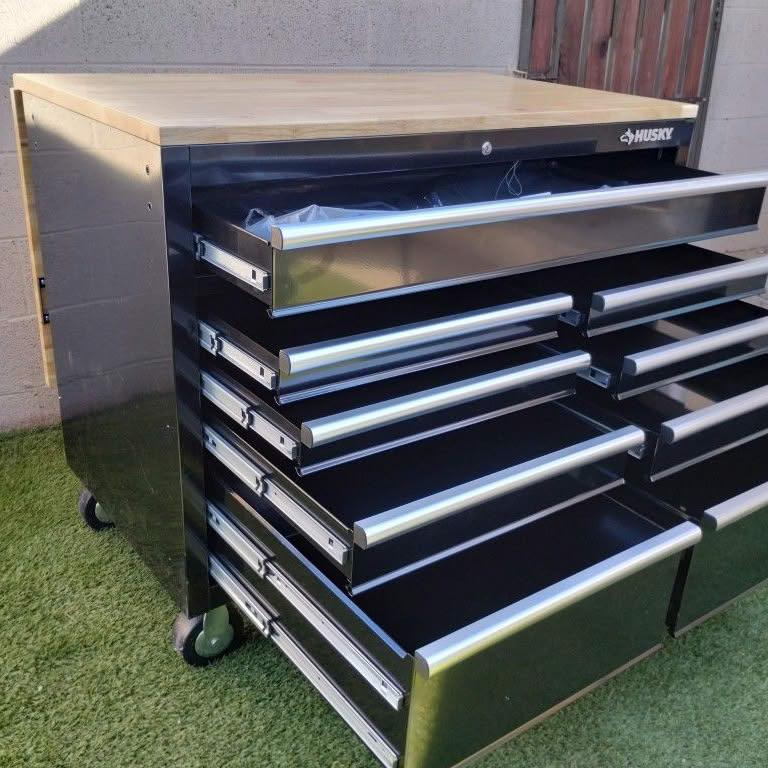 The all new Husky Extra-Deep 46 in. 9-Drawer Mobile Work Bench has arrived. This bundle includes the 46 in. Power Station with bins in order to provide additional storage and power supply. This work bench is 24.5 in. D, which creates 36% more storage capacity than traditional 18 in. D units. The extra-depth also means there is a much larger solid wood top to use as a work surface for all your projects. An integrated power strip on the side of the work bench provides easy access to power outlets and 2 USB Ports, so your tools and other electronic devices can always be charged up and ready to go. There is plenty of storage options within the work bench inside the 9 lockable 21.7 in. D drawers. Each drawer glides easily on 100 lbs. rated ball-bearing drawer slides and the large bottom drawers have an extra-set of slides to accommodate heavier items up to 200 lbs. Each drawer also has a premium pre-cut drawer liner that will protect both your tools and drawers. Finally, the entire work bench can easily move around your work space with four 5 in. x 2 in. casters and large ergonomic push handle.